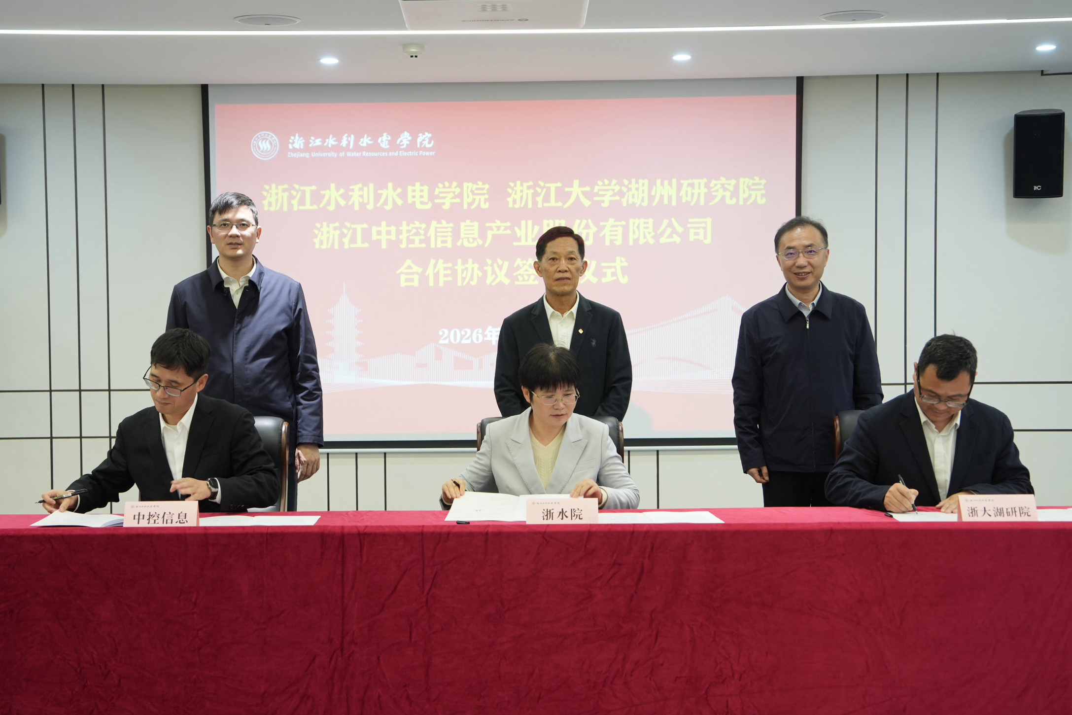 4月22日,浙江水利水电学院与浙江大学湖州研究院、浙江中控信息产业股份有限公司三方合作协议签约仪式在南浔校区举行。浙江省人民政府原参事杨献国、湖州市南浔区委书记程佳、浙江水利水电学院校长万健出席并见证签约。浙江水利水电学院副校长项春、浙江大学湖州研究院院长许超、浙江中控信息产业股份有限公司副总裁贺国君代表三方签署合作协议。此次三方签约将学校水利特色学科与人才培养优势、浙江大学湖州研究院“智能+”前沿科研优势、浙江中控信息产业股份有限公司基础设施数智化产业应用优势汇聚起来,形成“高校+平台+企业”的强强联合。三方将聚焦智慧水利与人工智能融合创新,深化产教融合,协同攻关核心技术、共育高素质应用型