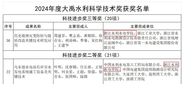 近日,2024年度大禹水利科学技术奖奖励结果发布。我校作为第一完成单位、水利工程学院周建芬副教授主持的专题研究 “历史堤塘灾变防控与提质改造关键技术研发应用”项目荣获大禹水利科学技术奖科技进步奖三等奖。我校作为第二完成单位、水利工程学院王铭明教授等参与的专题研究“乌东德水电站右岸引水发电系统施工装备及关键技术”项目荣获大禹水利科学技术奖科技进步奖二等奖。2024年度大禹水利科学技术奖共评出“大禹奖”自然科学奖一等奖1项、二等奖2项,技术发明奖一等奖1项、二等奖2项,科技进步奖特等奖1项、一等奖5项、二等奖21项、三等奖20项,创新团队奖2个。我校将以此次获奖为契机,不断提升科技创新能力,为推动水利学科高质量发展贡献更多力量。