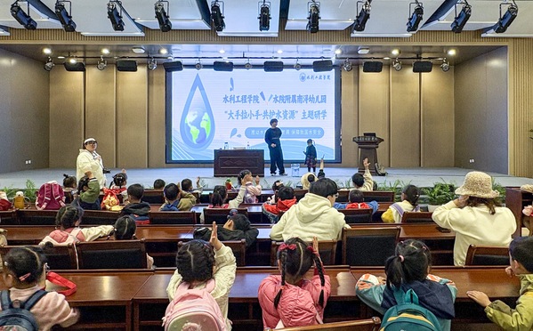 水利学院联合南浔办,面向附属南浔幼儿园、横街幼儿园师生,举办“大手牵小手・共护水资源”主题研学活动。30余名大学生志愿者化身“科普导师”,带领小朋友参观校园、参与水科学互动体验,向小朋友们传递节水护水知识。