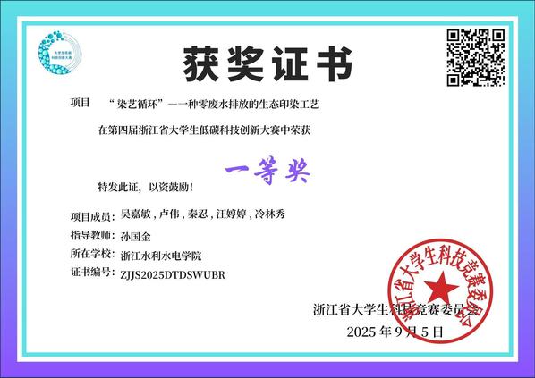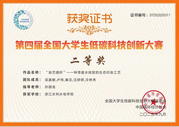 近日,在杭州举行的第四届大学生低碳科技创新大赛决赛, 环境学院孙国金老师指导的学生团队携“染艺循环”项目以“问题导向+实证支撑”进行多方答辩荣获国家级二等奖,实现了学院在A类学科竞赛获奖等级上的突破。