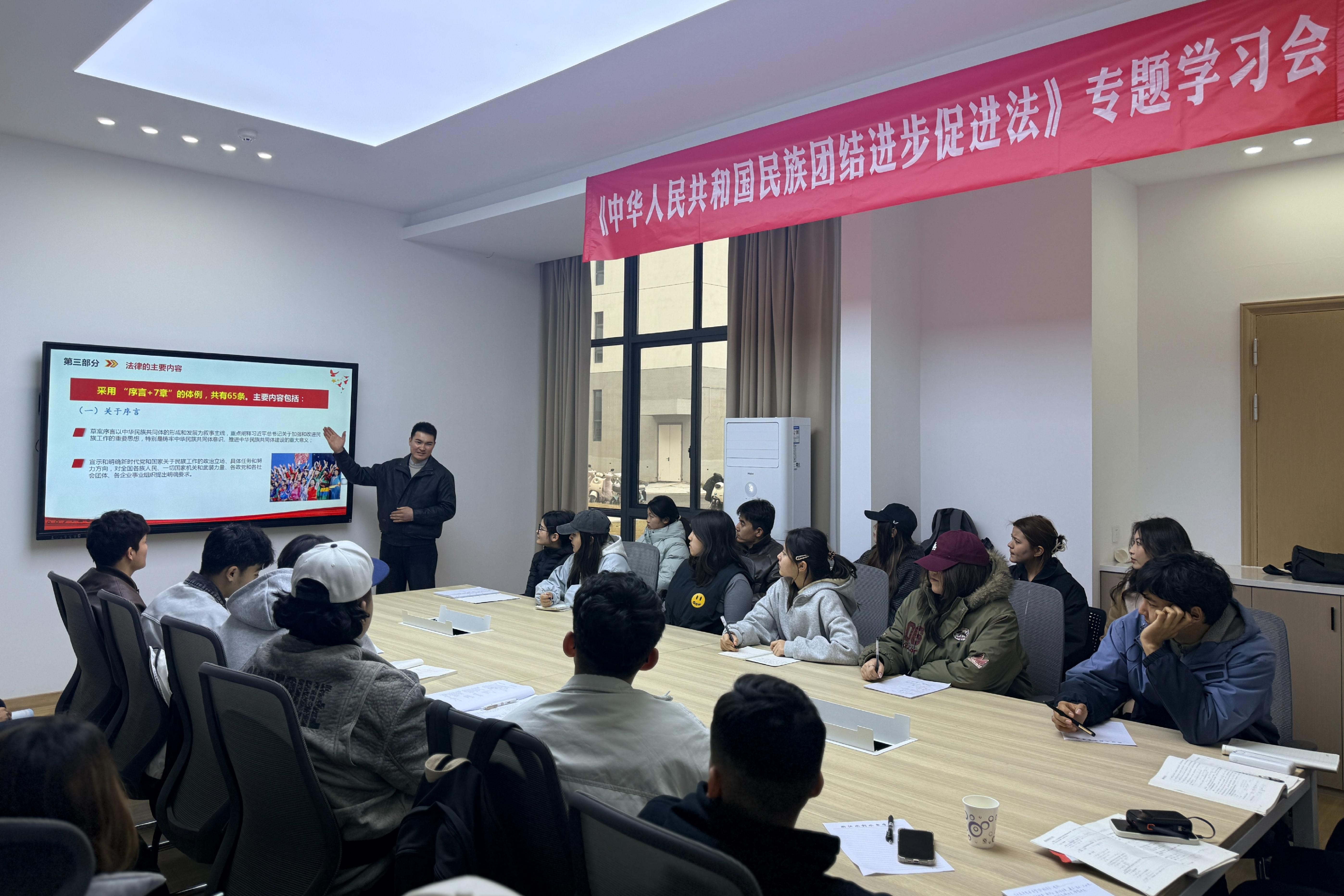 学习会上,民族生专职辅导员木台力甫·木沙带领全体民族生代表,系统学习了《中华人民共和国民族团结进步促进法》的立法背景、核心要义与实践要求,结合实际校园实际和学生成长特点,对相关条款进行了深入解读,帮助学生精准把握法律精神实质。学习结束后,各民族学生代表围绕法律条文、民族团结实践、个人成长与青年责任担当等主题展开热烈讨论。大家结合自身学习生活实际,畅谈对“五个认同”“四个与共”的理解与体会,一致表示,将以法律为准绳,自觉做民族团结进步的践行者与宣传者,在学习、生活中手足相亲、守望相助,共同呵护民族团结之花常开长盛。