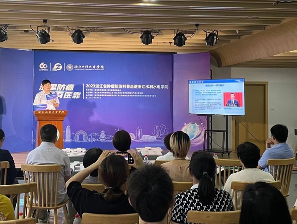 省肿瘤医院预防保健部主任黄静代表医院向我校赠送了“红船模型”,并表示浙江水院是省肿瘤医院首个走进的省内非医学类高校,希望学校进一步营造校园科普氛围,前移防癌关口,助力健康中国建设。省肿瘤医院防治科主任杜灵彬、医务部副主任何向明分别做了主题为《癌症预防、早早行动》《认识乳癌、科学护房》的科普宣讲。两位专家用权威详实的数据案例、丰富的临床经验及专业知识,深入浅出道明常发肿瘤的常见诱因与应对方法,让师生们深刻了解到癌症早筛与风险评估因素、以及肿瘤预防前置的重要性。师生积极互动,就关心的问题向专家们寻求了意见建议。活动现场氛围热烈,受到师生一致好评。