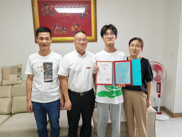7月27日上午,经管学院院长赵志江、学院党委副书记傅琪等一行来到杭州临平乔司,将经管学院第一封录取通知书送到杨宇涛同学手中,向其表示祝贺。傅琪代表学院赠予新生图书《平凡的世界》和学院纪念品。