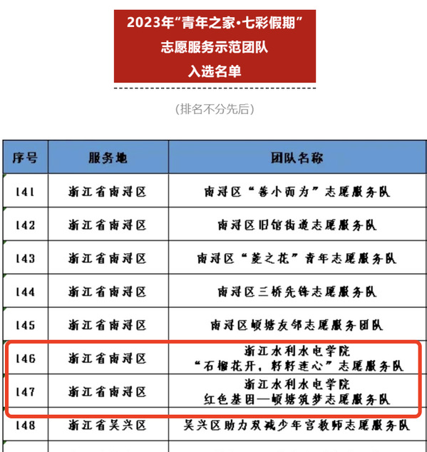 我校两支志愿服务队伍——浙江水利水电学院测绘与市政工程学院“石榴花开· 籽籽连心志愿服务队”、浙江水利水电学院建筑工程学院“红色基因—頔塘筑梦志愿服务队”入选2023年”青年之家·七彩假期“志愿服务示范团队(全国500项,浙江省71项)。