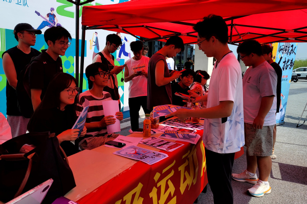 招新现场人头攒动,招新横幅鲜艳醒目,招新现场的海报展示了我校各支运动队的历史战绩、训练日常、基本要求以及教练员简介,吸引了大批2023级新同学驻足停留。各运动队教练员、运动员向在场的大一新生们介绍运动队情况并了解新生们的运动训练水平。“同学,快扫码加入我们田径队”“同学,也来羽毛球队看看”......招新队员们纷纷朝着往来的学弟学妹们吆喝。“上午已经有100多名新生报名进群了,估计到中午还会有更多同学加入。”一位在现场负责招新的足球队员介绍道。