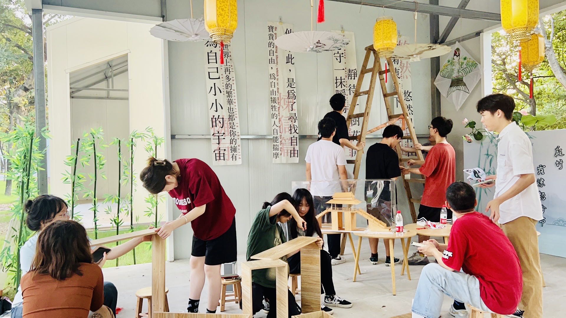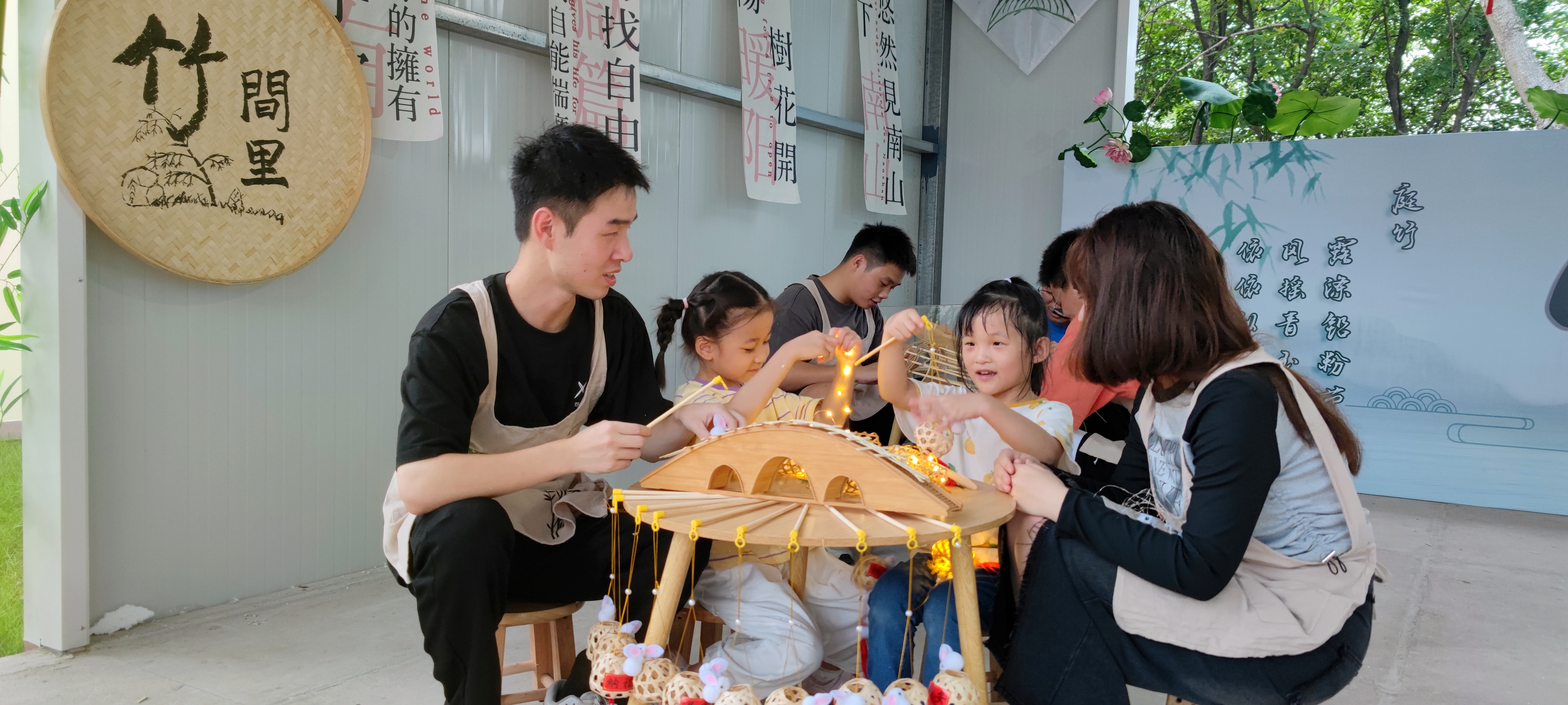 躬身打造梦想工坊,上好专业“实训课”。这间工坊位于钱塘区青潮园,起初只是一间50平米通透的板房。9月21日—29日,“竹间里”团队成员驻园10天,以“专业+非遗”为特色,打造并运营一间以传统节日为特色的竹艺品工坊,并为其命名为“竹间里”工作坊,工坊以灯笼和竹伞为顶,以风筝和竹画为墙面,设置体验、展示和售卖三区,处处展现着学生们的匠心与巧思。工坊运营后,坊内开展了多场研学活动,为工坊增添了人气与名气,有浙江水利水电学院测绘与市政工程学院与钱塘区学源幼儿园工坊推出的“大手拉小手·欢乐迎中秋”活动,有在校大中小学生开展的传统文化体验活动等,吸引大中小学生纷纷加入到梦想编织行列中。