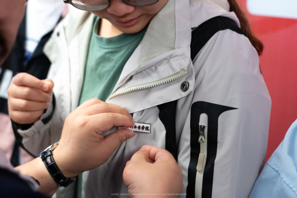 最后,我校各二级学院领导及导师为联培研究生们佩戴校徽,这标志着他们正式成为浙江水利水电学院的一份子。
