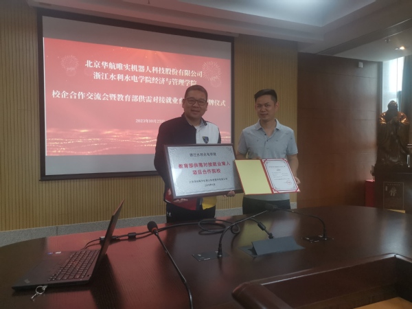 10月25日下午,经管学院与北京华航唯实机器人科技股份有限公司校企合作交流会暨教育部供需对接就业育人项目授牌仪式在我校举行。北京华航唯实机器人科技股份有限公司院校合作总监钟海龙、供需对接就业育人项目负责人张微、人才服务经理王笛笛,经管学院副院长蒋剑勇、物流工程教研室主任戴晋及部分物流工程专业教师出席了会议。