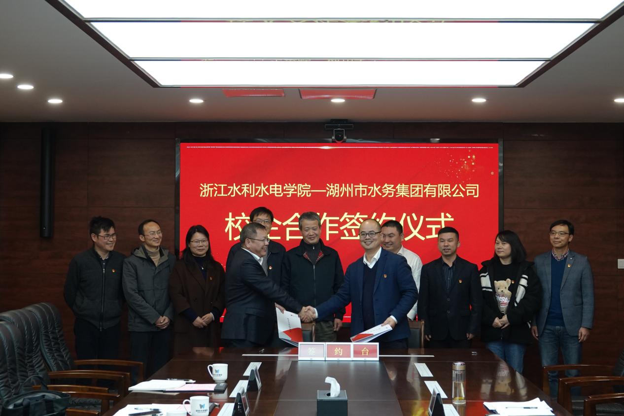 为深化产教融合,进一步打造校企协同育人共同体,近日,我校与湖州水务集团校企合作签约仪式在湖州水务集团举行。副校长沈自力、湖州水务集团董事长丁亮出席签约仪式。