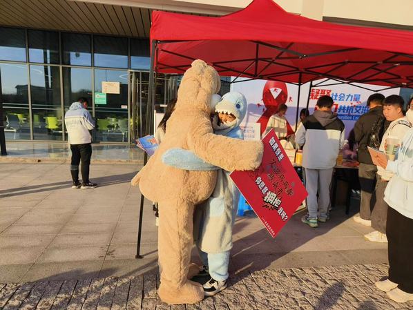 12月1日,校卫生所联合南浔区人民医院、校青春健康同伴社、机械学院青协在南浔校区开展宣教活动,向师生普及艾滋病健康防控知识,帮助师生正确认识生殖健康,拒绝高危行为,提高自身防护意识,做自身健康的第一责任人。活动中还贯穿了精彩的朗诵、飘扬的红丝带及手写祝福语等活动,增强了宣传趣味性,现场可爱的“抱抱团”和围观同学热情拥抱,让同学们明白对艾滋病患者要多一点关爱,少一点歧视,场面特别温馨,同学们积极参与,热情高涨。