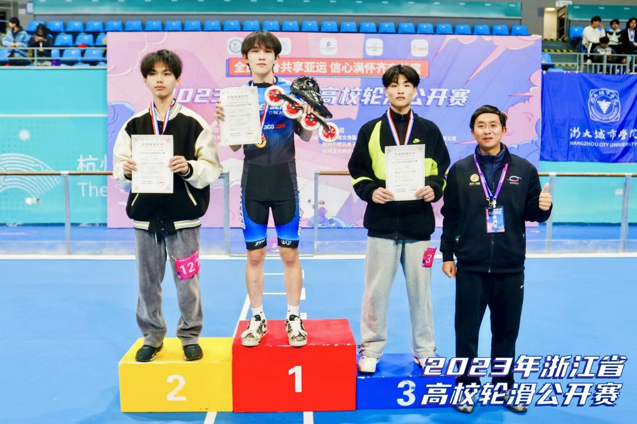 近日,2023年浙江省高校轮滑公开赛在杭州市钱塘轮滑中心顺利落幕。我校轮滑队在此次赛事中获得1枚金牌、1枚铜牌,团体总分三等奖,是我校首次在浙江省高校轮滑公开赛获得优异成绩,也是继2019年浙江省第15届大学生运动会轮滑比赛夺冠后又一次站上冠军奖台。机械与汽车工程学院机器人23-1班吴嘉智同学获得3000米淘汰赛冠军和1000米争先赛季军两个奖项。