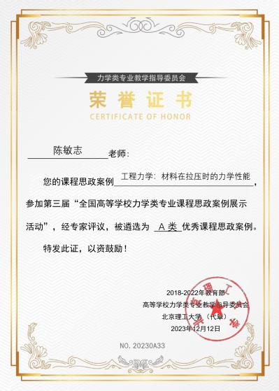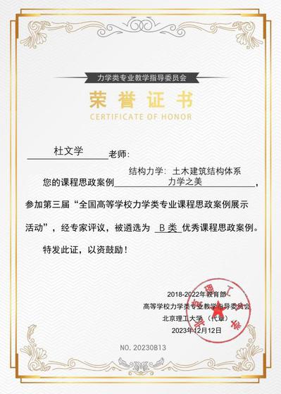12月14日,教育部高等学校力学类专业教学指导委员会公布了第三届“全国高等学校力学类专业优秀课程思政案例展示活动”优秀课程思政案例的遴选结果。建筑工程学院力学教研室申报的2项参赛案例均获奖。其中陈敏志所撰写的《工程力学:材料在拉压时的力学性能》获评A类优秀课程思政案例,杜文学所撰写的《结构力学:土木建筑结构体系力学之美》获评B类优秀课程思政案例。