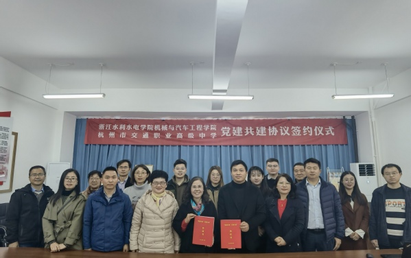 机械学院党委书记雷春香、杭州市交通职业高级中学党总支书记祁长伟代表双方签约。机械学院党委班子成员、车辆工程专业全体教师、车辆与材料工程党支部相关党员,杭州市交通职业高级中学校长金宏、副校长尹志等见证仪式。