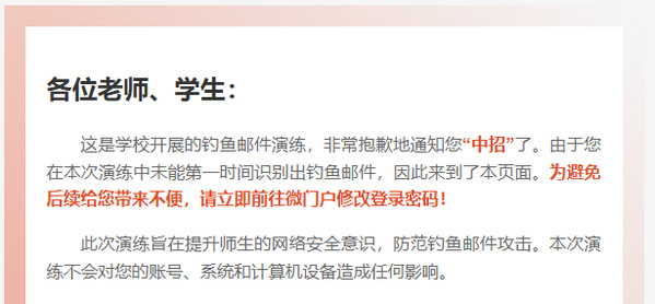 为提高学校师生对钓鱼邮件的识别能力,提升师生网络安全意识,防范化解钓鱼邮件风险隐患,根据省教育厅专项演练部署,近日,现教中心针对全校师生开展校级模拟黑客钓鱼邮件演练。