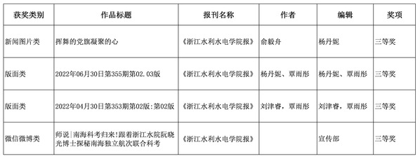 浙江省高校好新闻评比每年举行一次,由浙江省高等教育学会高校校园传媒分会组织开展上一年度作品评选,旨在展示全省高校校报年度工作成果,发挥优秀新闻作品的示范作用,推动高校新闻媒体事业发展。参评作品分消息、通讯、言论、版面、新闻图片和微信微博六个类型。近年来,我校积极挖掘学校优秀师生、先进团队事迹,弘扬主旋律、传播正能量,通过多种题材和不同角度把水院故事、水院温度传播到更高媒体平台,扩大学校的知名度,提高了学校的美誉度。