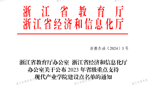 近日,浙江省教育厅办公室、浙江省经济和信息化厅办公室联合发布了《关于公布2023年省级重点支持现代产业学院建设点名单的通知》,我校正泰数智低碳现代产业学院获批省级重点支持现代产业学院建设点,这是学校首次获批该建设点。