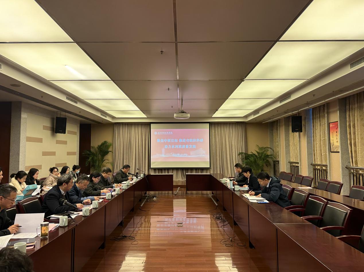 1月19日上午,学校在钱塘校区综合楼A区407会议室召开2024年科研工作会议,深入学习贯彻习近平总书记关于共同富裕的重要论述和考察浙江重要讲话精神,巩固拓展主题教育成果,聚焦申硕目标,推进有组织科研,助力水利高质量发展,推进共同富裕上进一步强担当、勇作为、谱新篇。副校长项春主持会议并讲话,科技处负责人及相关工作人员,各学院分管科研工作负责人、科研秘书参加会议。