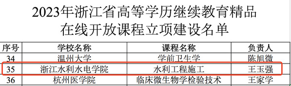 近日,浙江省教育厅办公室公布2023年浙江省高等学历继续教育精品在线开放课程立项建设名单,我校水利与环境工程学院王玉强副教授的《水利工程施工》入选该立项建设名单。