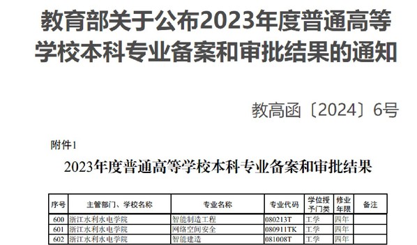 近日,教育部发布了《教育部关于公布2023年度普通高等学校本科专业备案和审批结果的通知》(教高函〔2024〕6号),我校获批增设3个本科专业——智能建造、智能制造工程、网络空间安全,具体信息如下:
