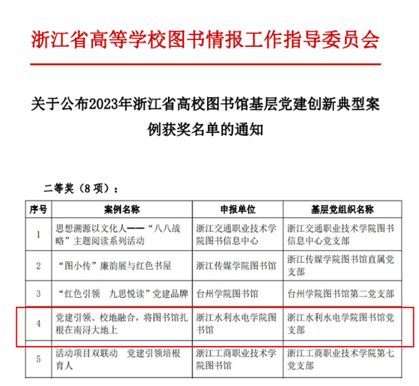 近日,由浙江省高等学校图书情报工作指导委员会主办的2023年浙江省高校图书馆基层党建创新典型案例评选活动获奖名单公布。我校图书馆党支部选送的案例《党建引领、校地融合,将图书馆扎根在南浔大地上》荣获二等奖。