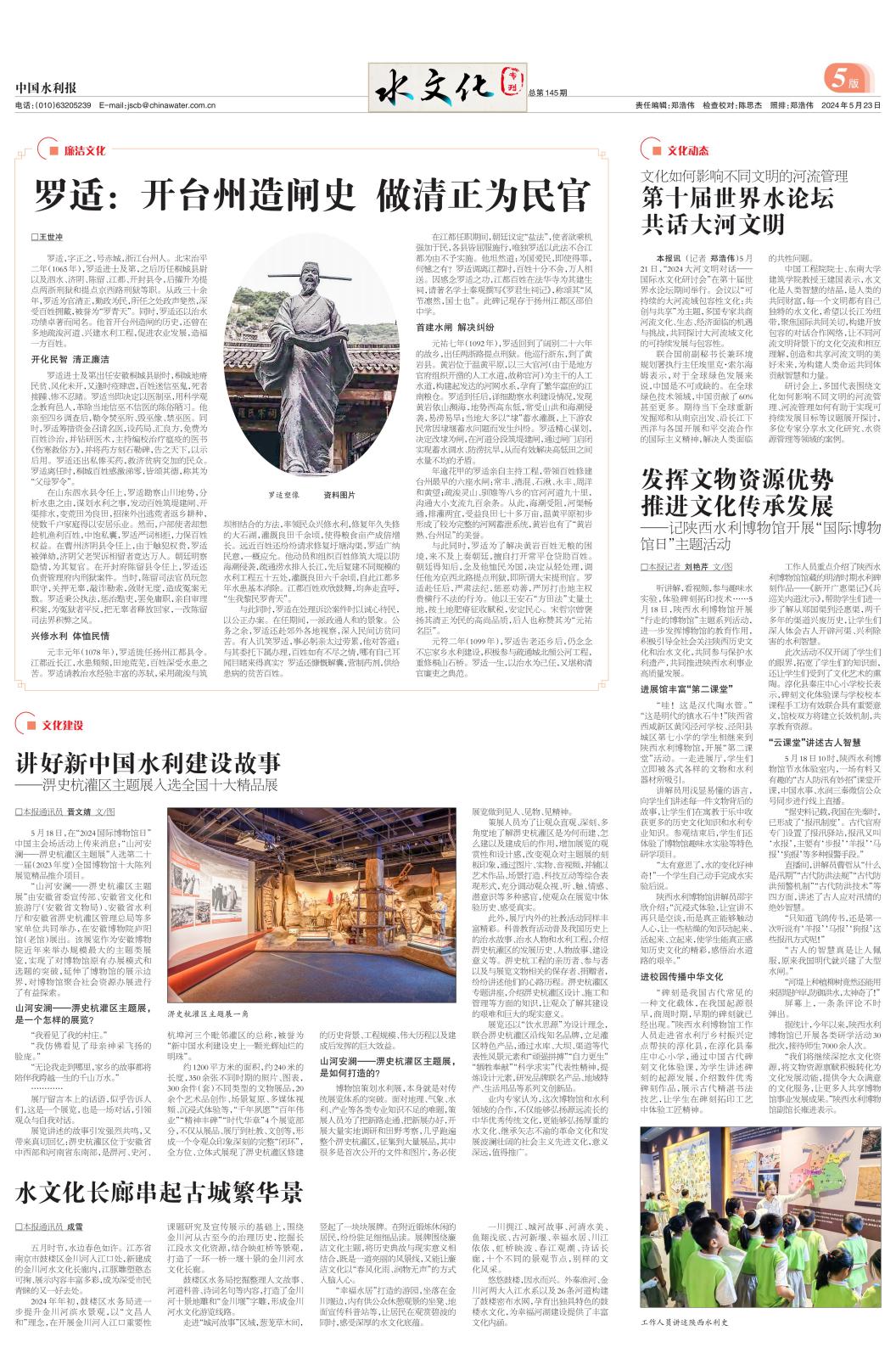 5月23日,中国水利报于145期5版水文化专刊头条刊发第23篇《罗适:开台州造闸史 做清正为民官》(原题为:《首开台州造闸史 清正为民“罗青天”——罗适》)。