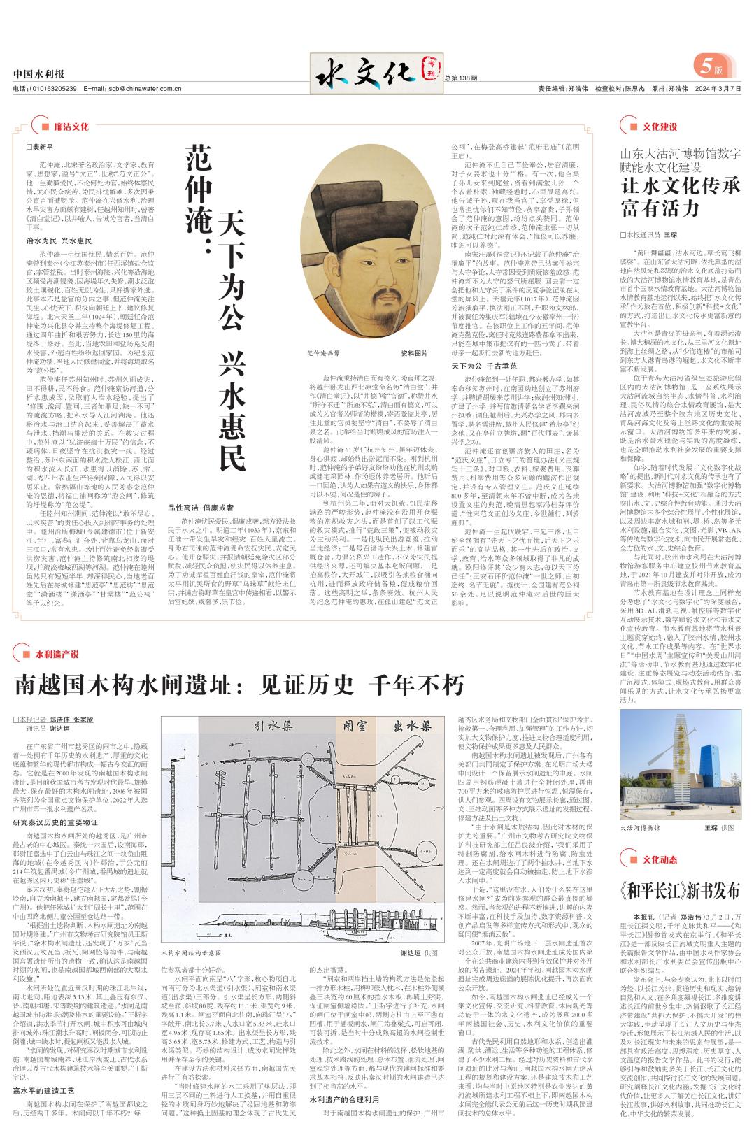3月7日,中国水利报于138期5版水文化专刊头条刊发《水利千秋 廉润初心——浙江治水历史人物廉洁故事》的第21篇《范仲淹:天下为公 兴水惠民》(原题为:《治水鞠躬尽瘁 为官清白如泉——范仲淹》)。