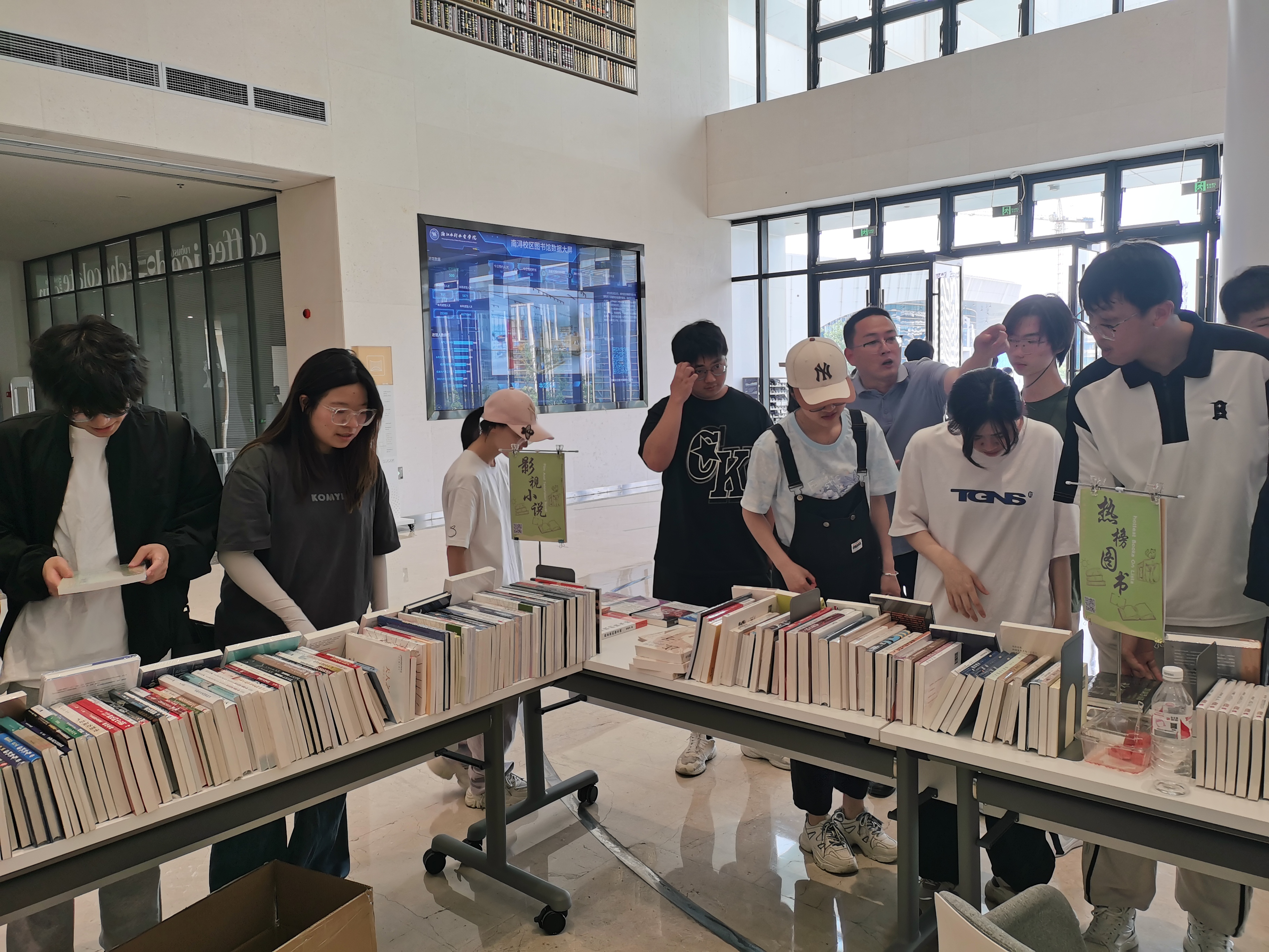 为深入推进全民阅读,营造书香水院氛围,近日,图书馆在南浔校区举办读书节“遇荐图书,共享书香”图书荐购活动。活动现场,书商提供的若干新书整理地展示在图书馆二楼大厅,师生们根据自己的喜好办理借阅,将新书直接带走,图书馆现场完成新书采购及读者借阅服务,图书归还后成为馆藏书籍,整个流程实现“你选我买”,简便快速。