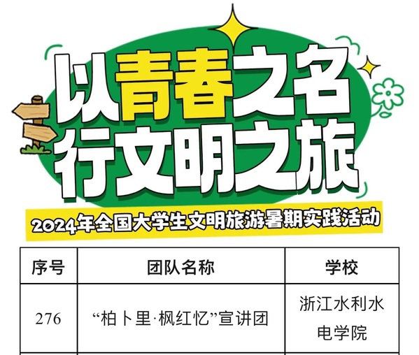 近日,由文化和旅游部市场管理司、教育部思想政治工作司、共青团中央青年发展部共同开展的“以青春之名 行文明之旅”——2024年全国大学生文明旅游暑期实践活动公布入选团队名单,我校“柏卜里·枫红忆”宣讲团成功入选。